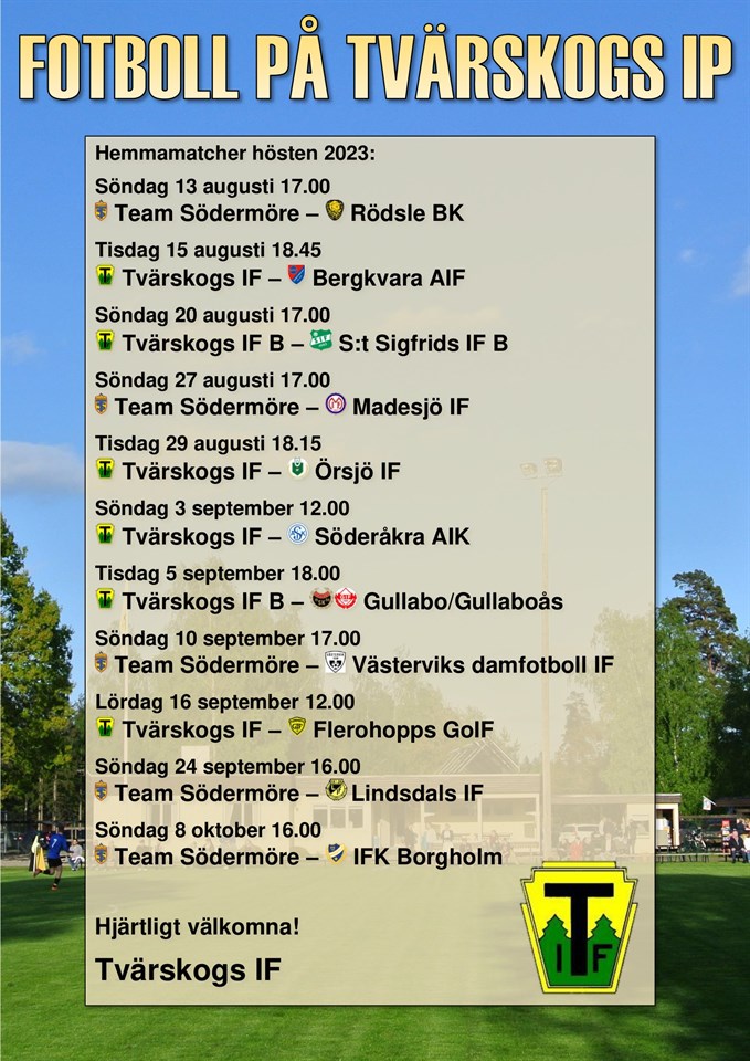 Samtliga planerade hemmamatcher på Tvärskogs IP hösten 2023. Klicka upp bilden med pilarna nere i högra hörnet för att se alla datum. Varmt välkomna! Tvärskogs IF 28 jul 2023