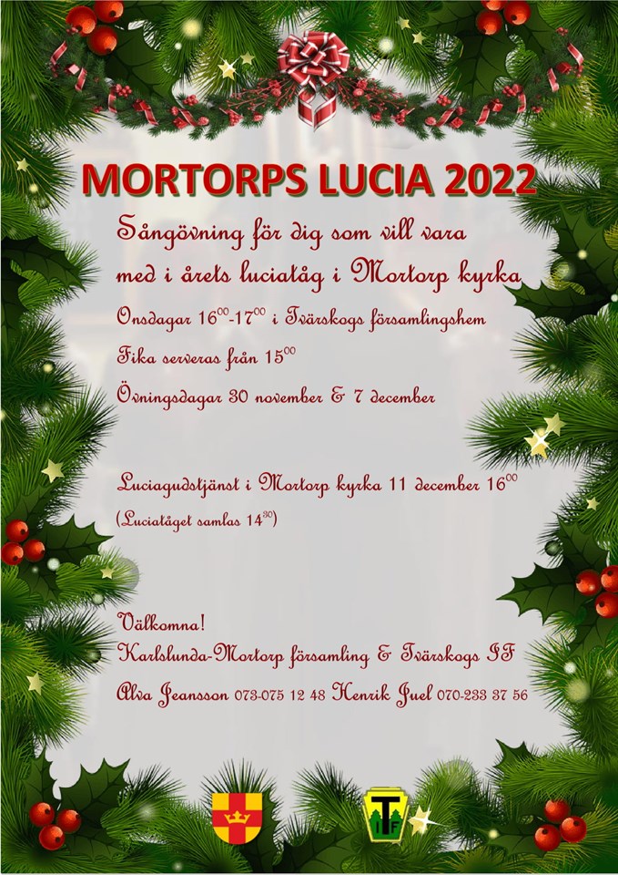 Sångövning för dig som vill vara med i årets luciatåg i Mortorp kyrka Onsdagar 16.00-17.00 i Tvärskogs församlingshem Fika serveras från 15.00 (ta skolbussen från Pårydskolan eller Södermöreskolan) Övningsdagar 30 november & 7 december Luciagudstjänst i Mortorp kyrka söndag 11 december 16.00 (Luciatåget samlas 14.30) Välkomna! Karlslunda-Mortorp församling & Tvärskogs IF