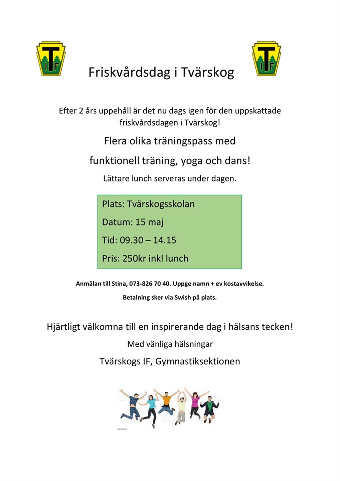 Efter 2 års uppehåll är det nu dags igen för den uppskattade friskvårdsdagen i Tvärskog! Flera olika träningspass med funktionell träning, yoga och dans! Lättare lunch serveras under dagen. Plats: Tvärskogsskolan Datum: 15 maj Tid: 09.30 – 14.15 Pris: 250kr inkl lunch Anmälan till Stina, 073-826 70 40. Uppge namn + ev kostavvikelse. Betalning sker via Swish på plats. Hjärtligt välkomna till en inspirerande dag i hälsans tecken! Med vänliga hälsningar Tvärskogs IF, Gymnastiksektionen Tvärskogs IF 20 apr 2022