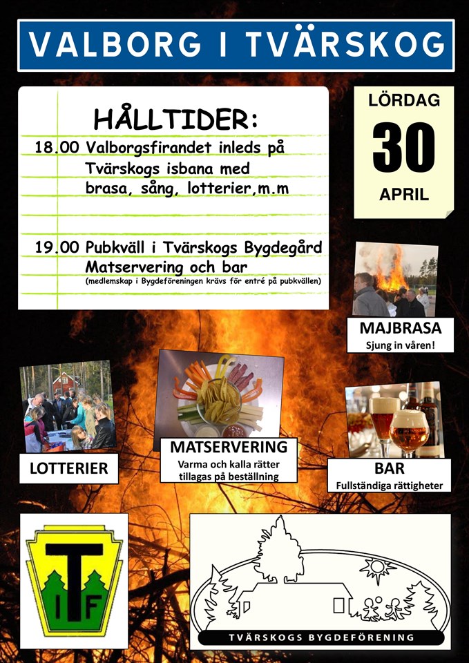 Valborgsfirandet i Tvärskog inleds 18.00 på isbanan med brasa, sång och aktiviteter. 19.00 slår Bygdeföreningen upp portarna till pubkväll i bygdegården. Välkomna! Tvärskogs IF 23 apr 2022
