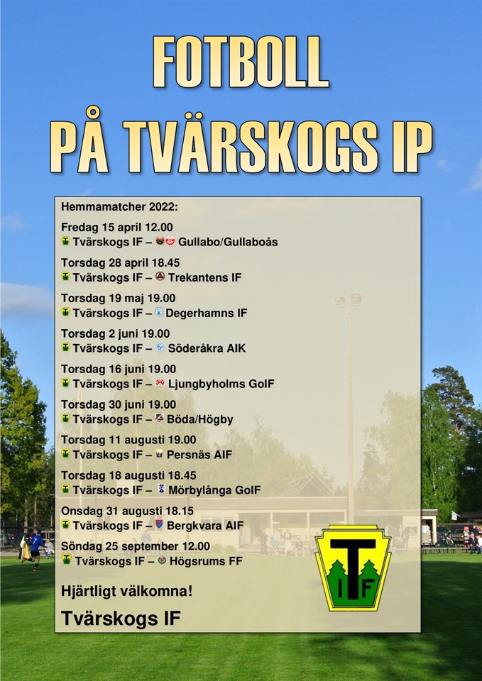 Samtliga planerade hemmamatcher för Tvärskogs IFs herrlag 2022. Varmt välkomna till Tvärskogs IP! Tvärskogs IF 15 mar 2022