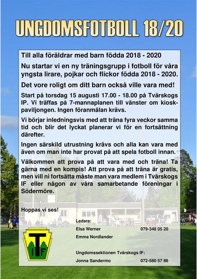 Nu startar vi en ny träningsgrupp i fotboll för våra yngsta lirare, pojkar och flickor födda 2018 - 2020. Det vore roligt om ditt barn också ville vara med! Start på torsdag 15 augusti 17.00 - 18.00 på Tvärskogs IP. Vi träffas på 7-mannaplanen till vänster om kiosk-paviljongen. Ingen föranmälan krävs. Vi börjar inledningsvis med att träna fyra veckor samma tid och blir det lyckat planerar vi för en fortsättning därefter. Ingen särskild utrustning krävs och alla kan vara med även om man inte har provat på att spela fotboll innan. Välkommen att prova på att vara med och träna! Ta gärna med en kompis! Att prova på att träna är gratis, men vill ni fortsätta måste man vara medlem i Tvärskogs IF eller någon av våra samarbetande föreningar i Södermöre. Hoppas vi ses! Ledare: Elsa Werner 079-348 05 20 Emma Nordlander Ungdomssektionen Tvärskogs IF: Jonna Sandermo 072-580 57 86 Tvärskogs IF 9 aug 2024